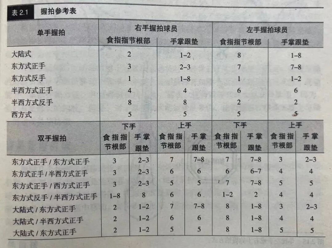 Although both methods involve the "pinky knuckle-to-palm heel alignment," the tennis community is still divided on this approach. The author doesn’t intend to spend much more time debating exactly which surface the pinky knuckle should align with—instead, a table from Nick’s classic book, *The Tennis Handbook*, is provided here for your reference.