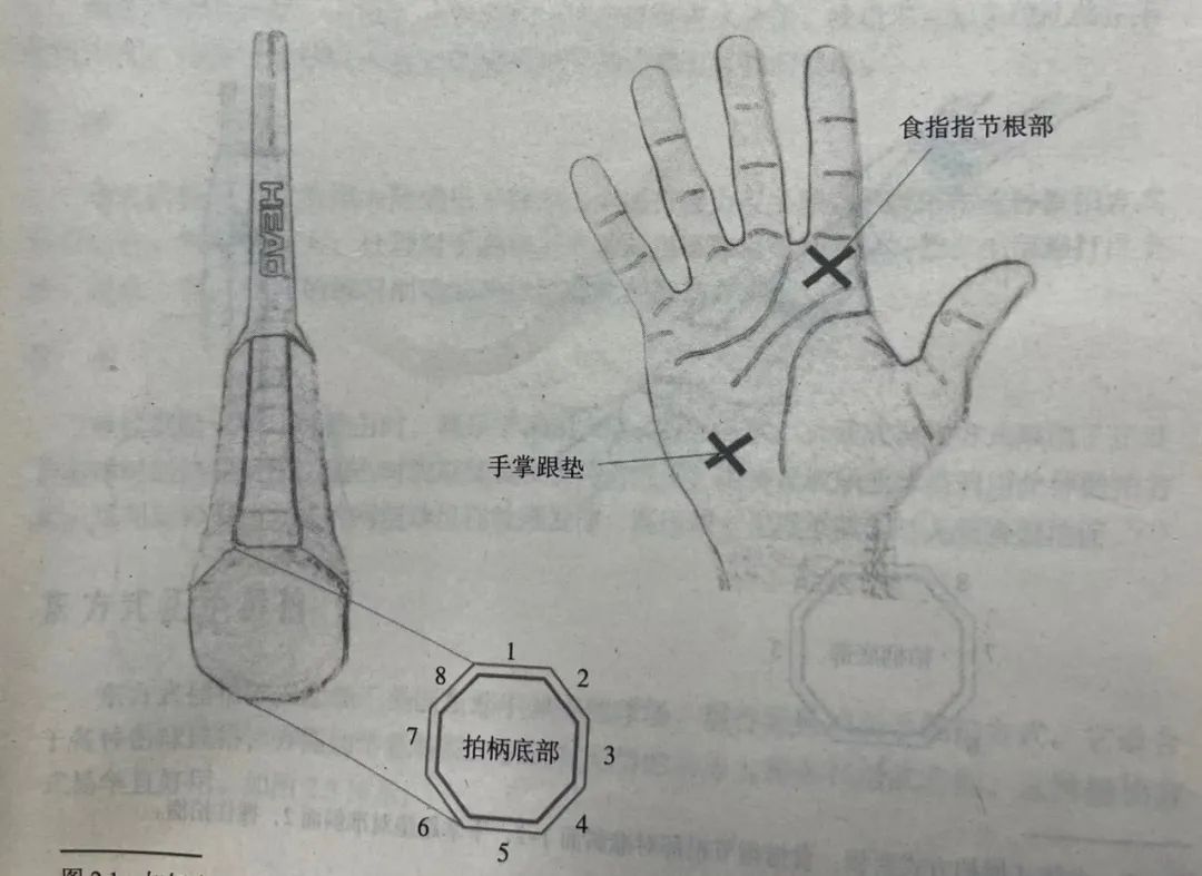 The author believes that adopting the "index finger knuckle base-to-palm heel pad alignment method" is the best choice for learning how to hold the racket properly. Under this technique, the eight angled surfaces of the racket handle are numbered 1 through 8 in a clockwise sequence. Players simply place the base of their index finger knuckle and the heel pad of their palm on the corresponding numbered surface, ensuring they master the correct grip technique every time. For instance, when using a semi-Western forehand grip, the base of the index finger knuckle should align with surface No. 4, while the palm heel pad rests firmly against surface No. 4 as well.