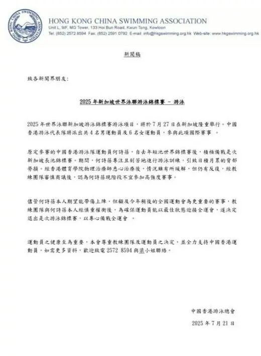 The Hong Kong Swimming Association of China stated in a press release that since last year's World Short Course Championships, Siobhan Haughey has been diligently preparing for this year's World Championships in Singapore. However, her intense training schedule led to a strain in her back. While careful treatment has helped ease the condition somewhat, it has continued to recur. After careful consultation with her coaching team, it was determined that Siobhan is currently not ready to compete in high-intensity events.