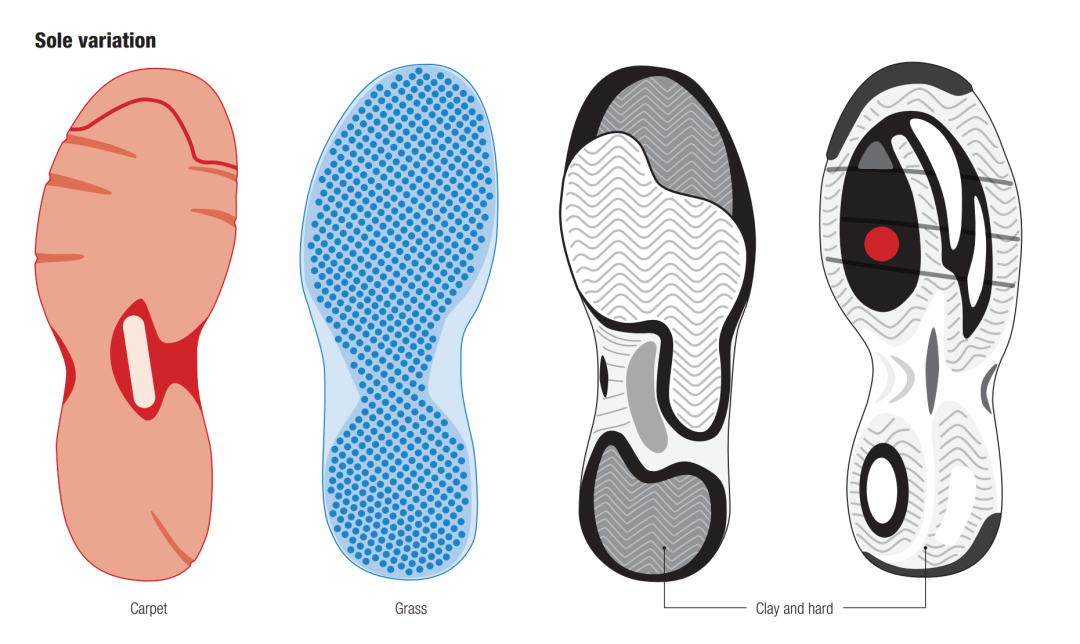 The addition of circular features on the ball of the foot (as in the shoe on the far right) is intended to help the player turn quickly on hard or clay courts.