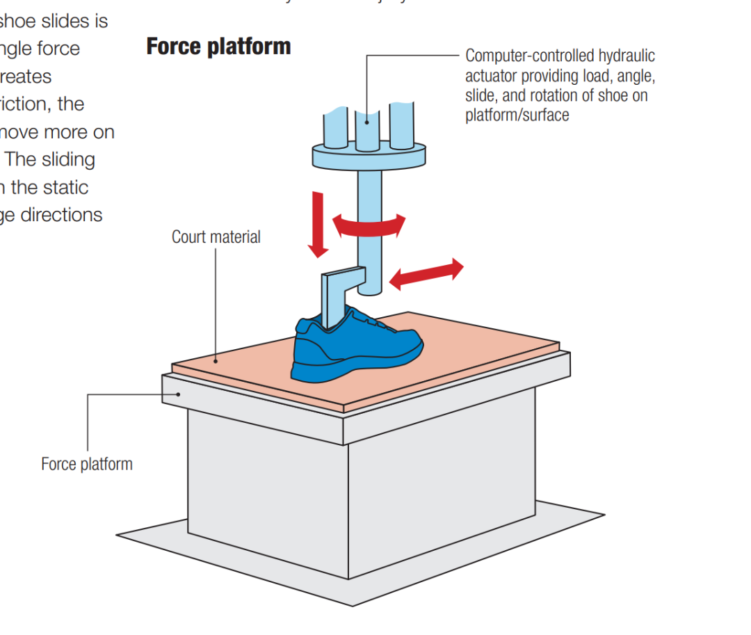 A biomechanical force platform is a specialized testing device used to measure the friction performance of athletic shoes.