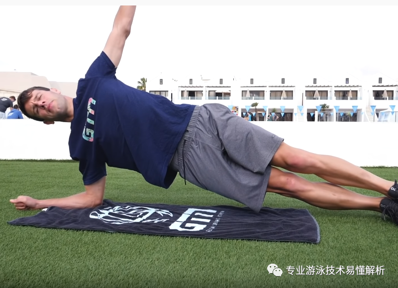 Similarly, the plank exercise can also be modified into a side-body strength workout. By simultaneously engaging the arm and leg on one side of the body to lift and support it—keeping the upper arm, elbow, and foot in contact with the ground while maintaining the side-plank position—you can enhance your ability to stabilize your hips. This exercise is particularly beneficial for maintaining hip stability and improving lateral body rotation during swimming.