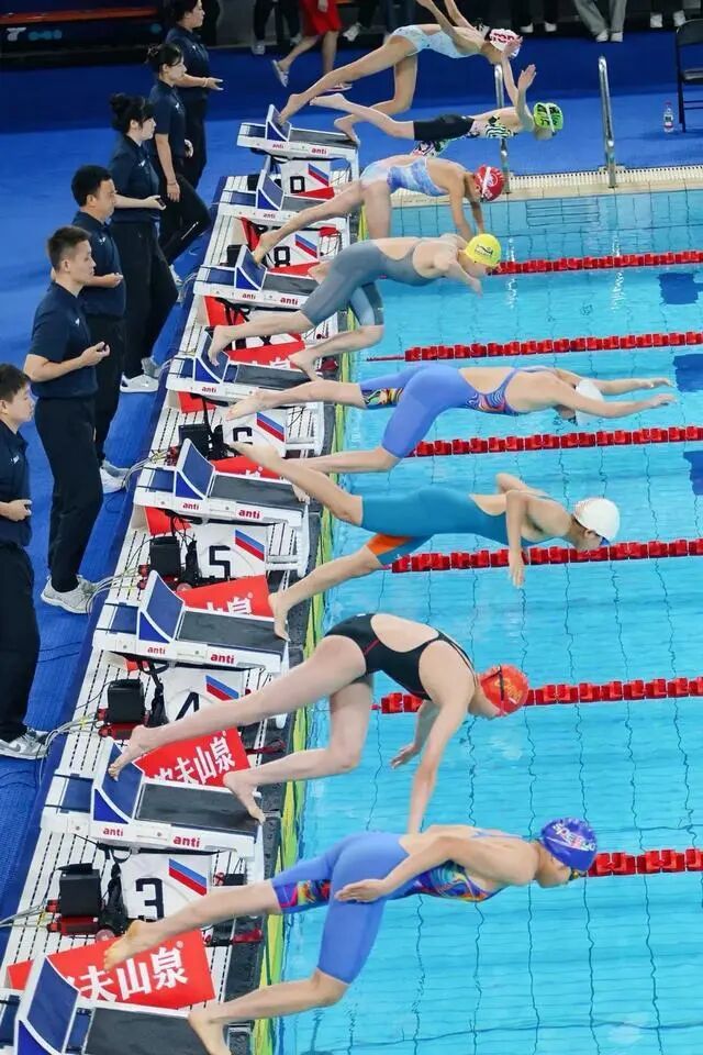 That morning, the swimming and diving arena buzzed with excitement as young athletes eagerly awaited their turn at the starting blocks. "On your marks!" With the sound of the starter's pistol, the first group of female 50-meter freestyle swimmers shot off like arrows, officially kicking off the competition. The youngsters powered through the water with all their might, while cheers and shouts of encouragement echoed continuously from the stands above.