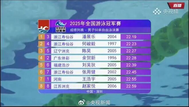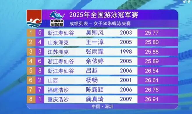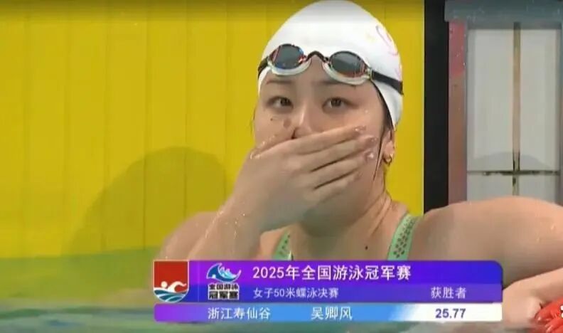 On May 23, the 2025 National Swimming Championships entered its 7th competition day, with finals held in six events that day.In the women's 50m butterfly final, Zhejiang’s Wu Qingfeng clinched the gold medal with a time of 25.77 seconds, while Shandong’s Wang Yichun took home the silver in 25.80 seconds, and Zhang Yufei secured bronze in 25.88 seconds. The World Championships A standard is 26.23 seconds, a mark that several swimmers achieved during the preliminaries and semifinals. According to the selection criteria, Wu Qingfeng and Wang Yichun have earned their spots at the World Championships, while Zhang Yufei has been granted priority reserve qualification.Zhang Yufei set the Asian record in her event (25.05) at the 2023 Fukuoka World Aquatics Championships, and she also claimed the meet record at the 2023 National Championships (25.57).In the men's 50m freestyle final, Pan Zhanle clinched the gold medal with a time of 22.19 seconds, edging out He Junyi by a narrow margin of 0.04 seconds—He finished second with 22.23 seconds. Chen Hao secured third place, touching in at 22.27 seconds. Notably, Pan Zhanle’s performance didn’t quite meet the World Championships A standard (22.05). Meanwhile, national record holder Yu Hexin, who clocked 22.28 seconds, missed out on the podium and finished fourth.This also marks Pan Zhanle’s seventh gold medal at this competition: four individual freestyle golds in the 50m, 100m, 200m, and 400m events, along with three relay golds—winning the men’s 4×100m freestyle relay, the men’s 4×200m freestyle relay, and the mixed 4×100m medley relay.In the women's 200m backstroke final, Peng Xuwei claimed the gold medal with a time of 2:07.63, while Liu Yaxin took home the silver with 2:09.09, and Qian Xin'an secured bronze in 2:10.45. Notably, all five top finishers met the World Championships A standard (2:11.08).