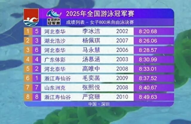 In the women’s 800m freestyle final, Li Bingjie from Hebei, the Asian record holder (8:13.31), clinched the gold medal with a time of 8:20.68—more than 5 seconds ahead of silver medalist Yang Peiqi. This remarkable performance completed Li’s sweep of all three freestyle events at this championship, following her victories in the women’s 200m and 1500m freestyle races. Yang Peiqi finished second with a time of 8:26.06. Meanwhile, young swimmer Ma Yonghui secured third place, clocking in at 8:27.57. Notably, the World Championships A-standard for this event is 8:34.62, and all five finalists easily surpassed that mark.