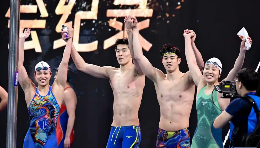In the mixed 4x100m freestyle final, the Zhejiang team—comprising He Junyi, Pan Zhanle, Wu Qingfeng, and Yu Yiting—claimed victory with a time of 3:24.14, shattering their own meet record of 3:27.01 set earlier by the same team. Guangdong finished second with 3:27.09, while Hubei took third place in 3:27.85. This gold medal brings Pan Zhanle’s total to eight Olympic golds.From left to right: Yu Yiting, He Junyi, Pan Zhanle, Wu QingfengAdditionally, in the men's 50m backstroke semifinal, Zhejiang swimmer Xu JiaYu clocked a time of 24.38 seconds—far ahead of the World Championships A-standard (25.11)—and not only shattered the meet record (24.42) but also tied his own national record, which he set at the 19th Hangzhou Asian Games in 2023. At the 2023 Fukuoka World Swimming Championships, Xu JiaYu earned a bronze medal with a time of 24.50 seconds.