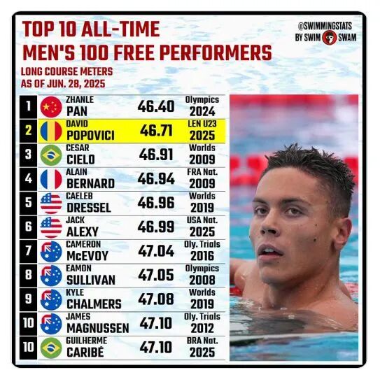 46.71! Popovich breaks the European record in the 100m freestyle, now second only to Pan Zhanle's world record.