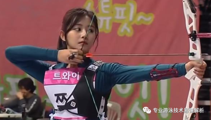 When shooting an arrow, the arm holding the bow forward is like a hand extended in water—steady and consistently pointing straight ahead. Meanwhile, the other arm acts as the recovery phase, preparing to enter the water. The drawn bowstring mimics the movement of a leg being pulled back or lifted, both building momentum for the next powerful stroke. And just as a relaxed bowstring represents a leg that has already completed its powerful kick by pushing against the water, this leg should now be completely relaxed.