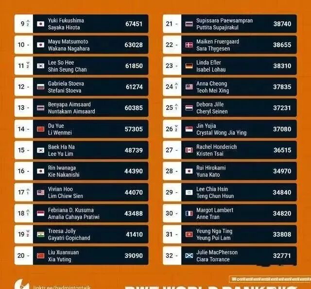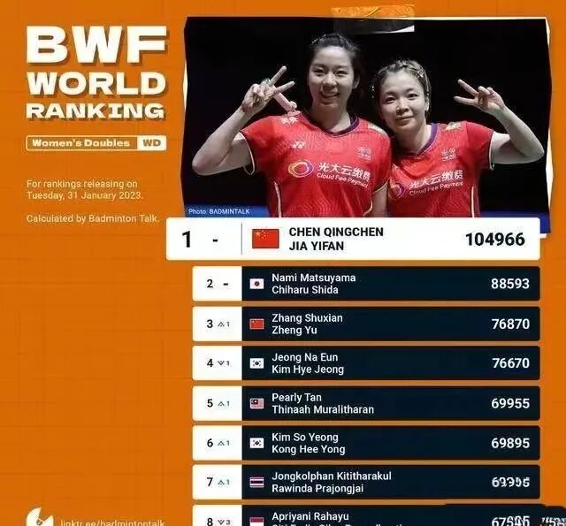 Fan Chen continues to hold a significant lead, while Yu Xian is absent, causing her ranking to climb one spot. Meanwhile, Zheng Na Yin/Kim Hye Jin have now held the world No. 3 position for just one week.