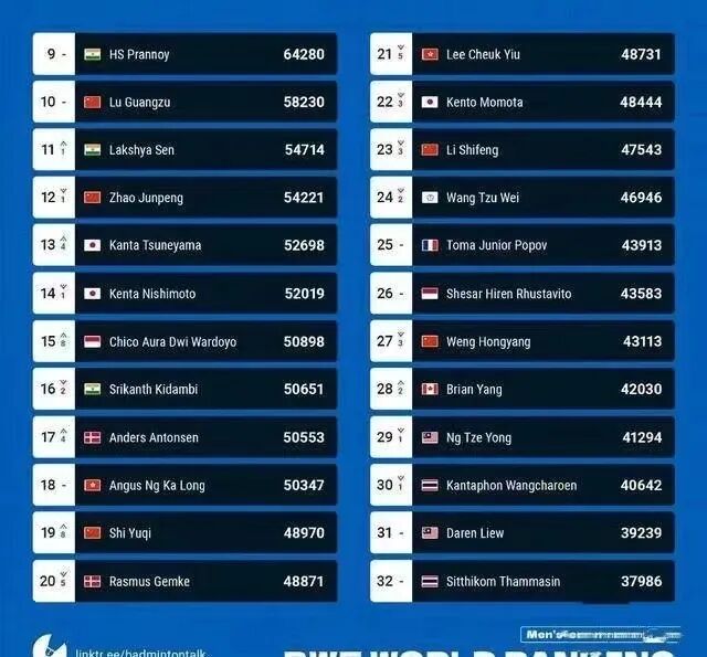 China's Lu Guangzu remains at No. 10, while Zhao Junpeng drops one spot. Shi Yuqi advances to the semifinals, climbing 8 places in the rankings, whereas Li Shifeng falls three spots. Meanwhile, Weng Hongyang suffers a first-round exit for the third consecutive tournament, dropping another three places. If he fails to bounce back soon, he could fall out of the top 32 once points from his Korean Open title are deducted.
