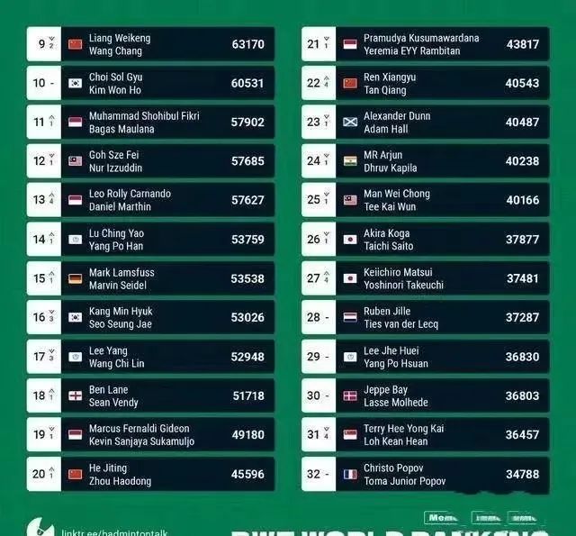 The top 6 remain unchanged. Liang Weikeng and Wang Chang earned one silver, one gold, and reached the round of 16 in the new season, dropping two spots in the rankings. He Jiteng and Zhou Haodong made history by reaching their first-ever high-level tour final, securing a runner-up finish with 7,800 ranking points—enough to replace (and deduct) their previous 3,000 points, propelling them up one spot in the standings. Meanwhile, Ren Xiangyu and Tan Qiang advanced to the round of 16, earning 3,600 ranking points to replace their earlier 2,660 points, climbing three places higher in the rankings.