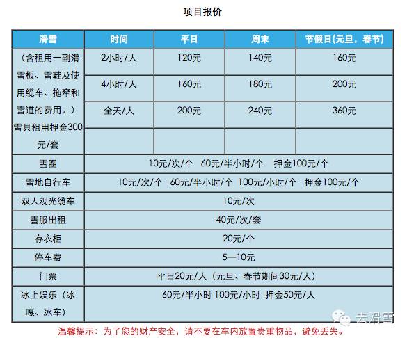 Weekend rate: 79 RMB per person (includes admission, all-day skiing, and ski equipment).