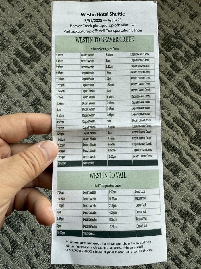 Because I tipped the parking attendant $20, he delivered my luggage and then rushed back to knock on my door, breaking the bad news—and handing me a little slip of paper listing the shuttle bus schedules from the hotel to Beaver Creek and Vail.