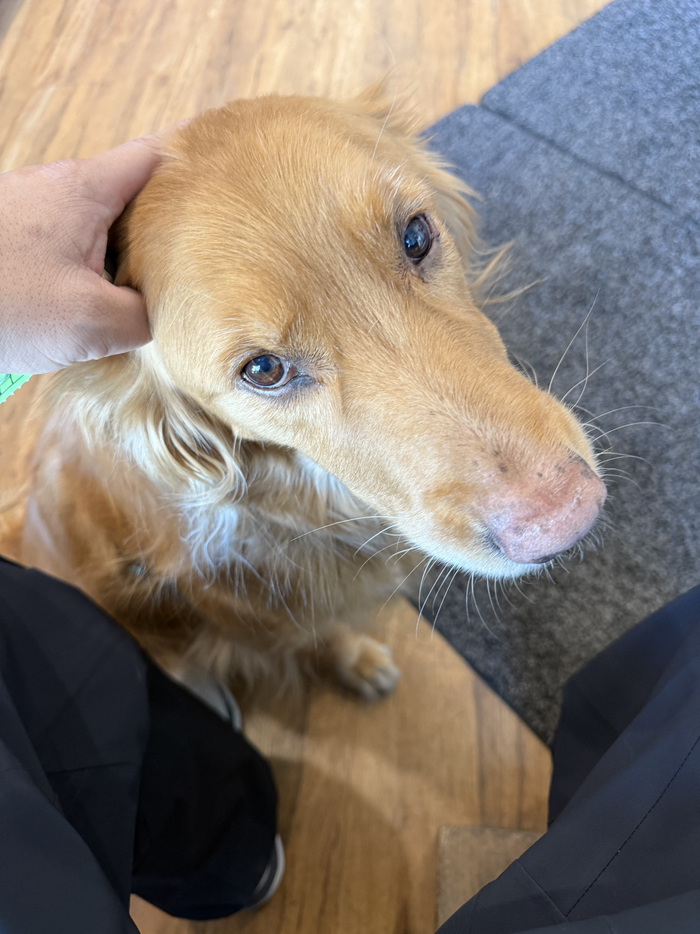 The adjusted shoes are much better, but my left foot still feels pinched and painful—so I’m heading back to get them tweaked again. While I’m at it, I casually gave this golden retriever a quick pet for free.