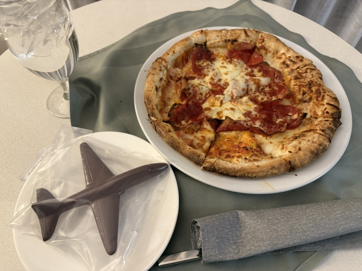 I ordered a hotel pizza—it was surprisingly expensive, almost $40. And as for dessert, there was this huge chocolate bar shaped like a little airplane. When I placed the order, I totally forgot it was my birthday today; otherwise, I’d definitely have gone with steak and Coke instead.