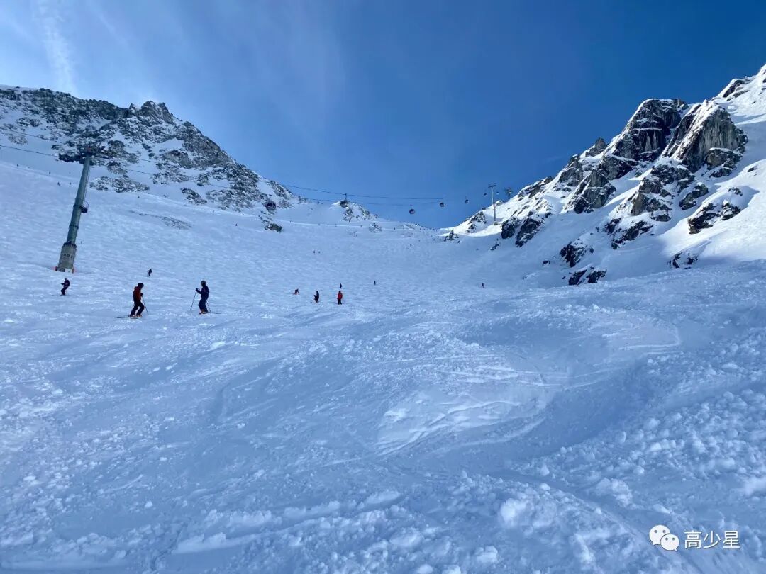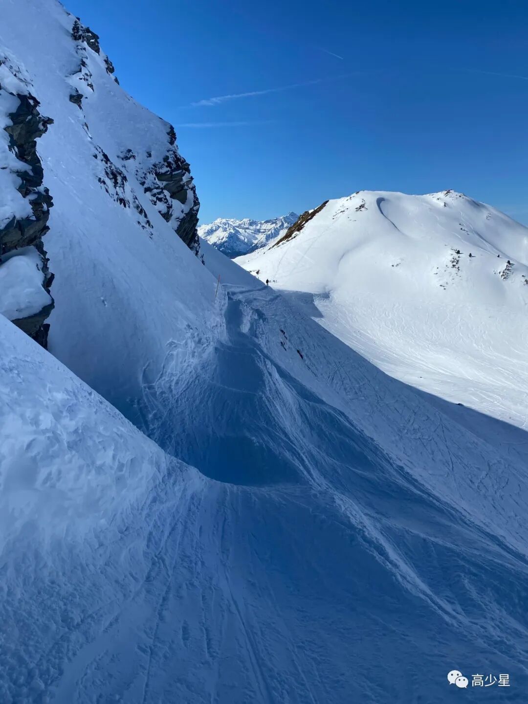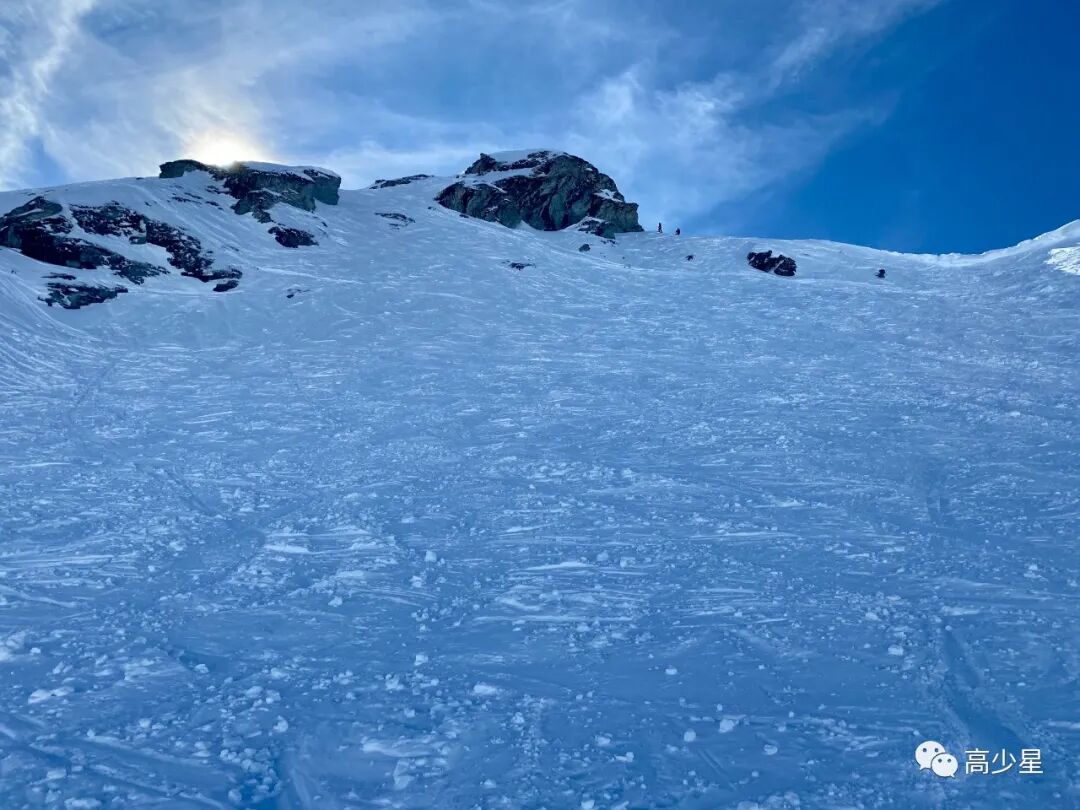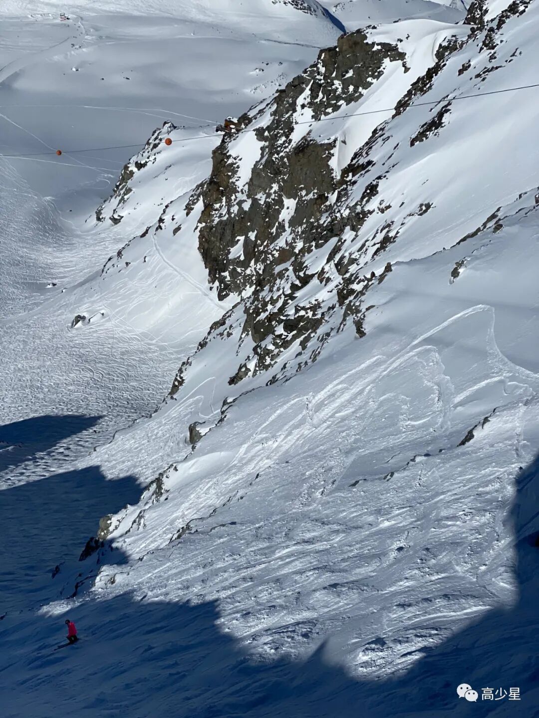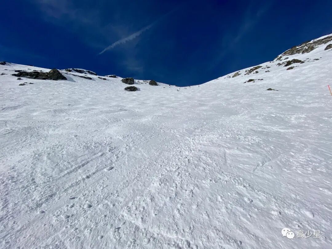 From the scale of the photo, you can clearly see that it’s longer and wider than expected—mainly because there was no machine grooming; it had just started snowing lightly, and with quite a few skiers already out on the slopes, the surface was mostly covered with a mix of small to medium-sized mushrooms of fresh powder. Having spent the day skiing on icy terrain in Zermatt earlier, this run felt absolutely exhilarating—I hadn’t engaged in such intense physical activity for ages. As a result, I ended up stopping eight times along the way just to catch my breath and regain my energy!