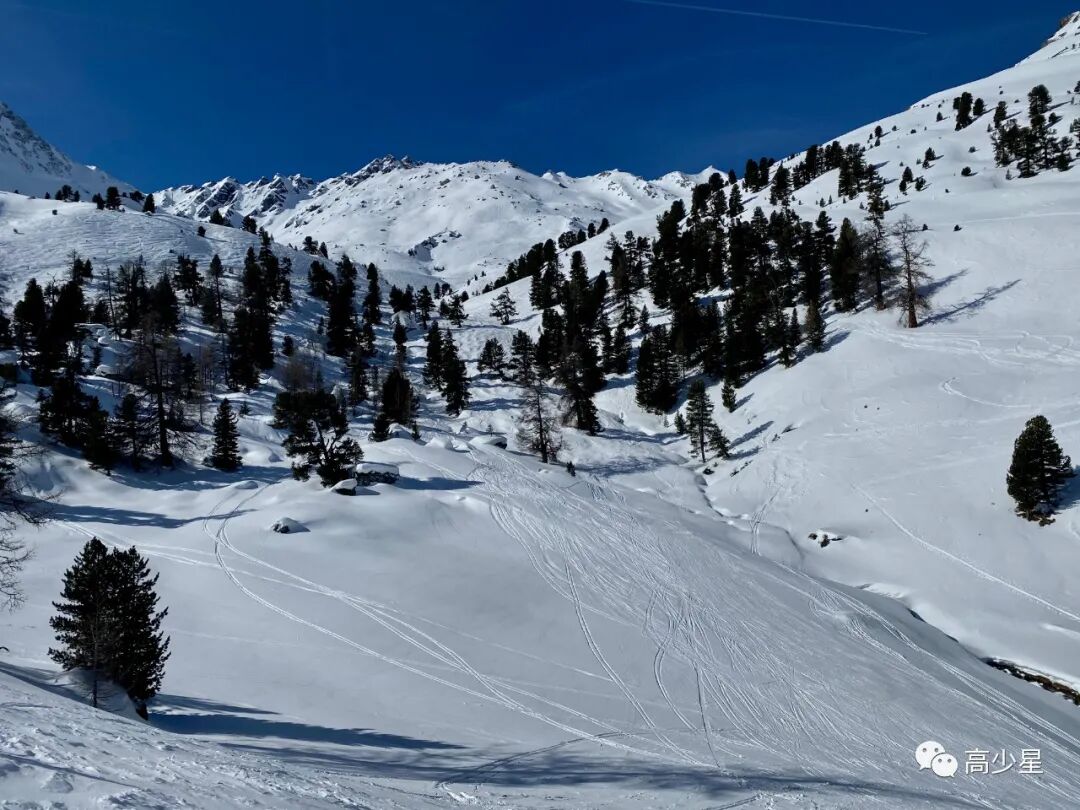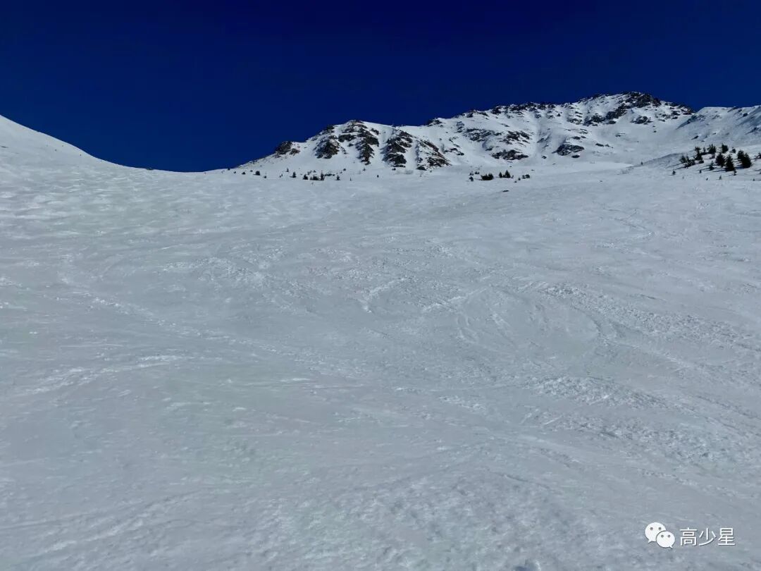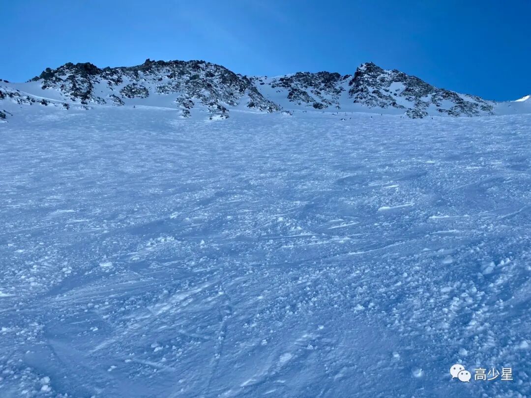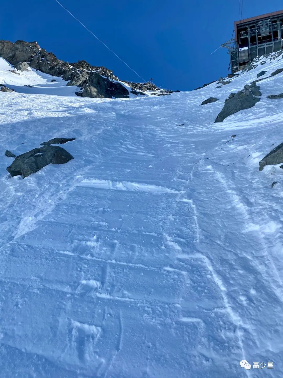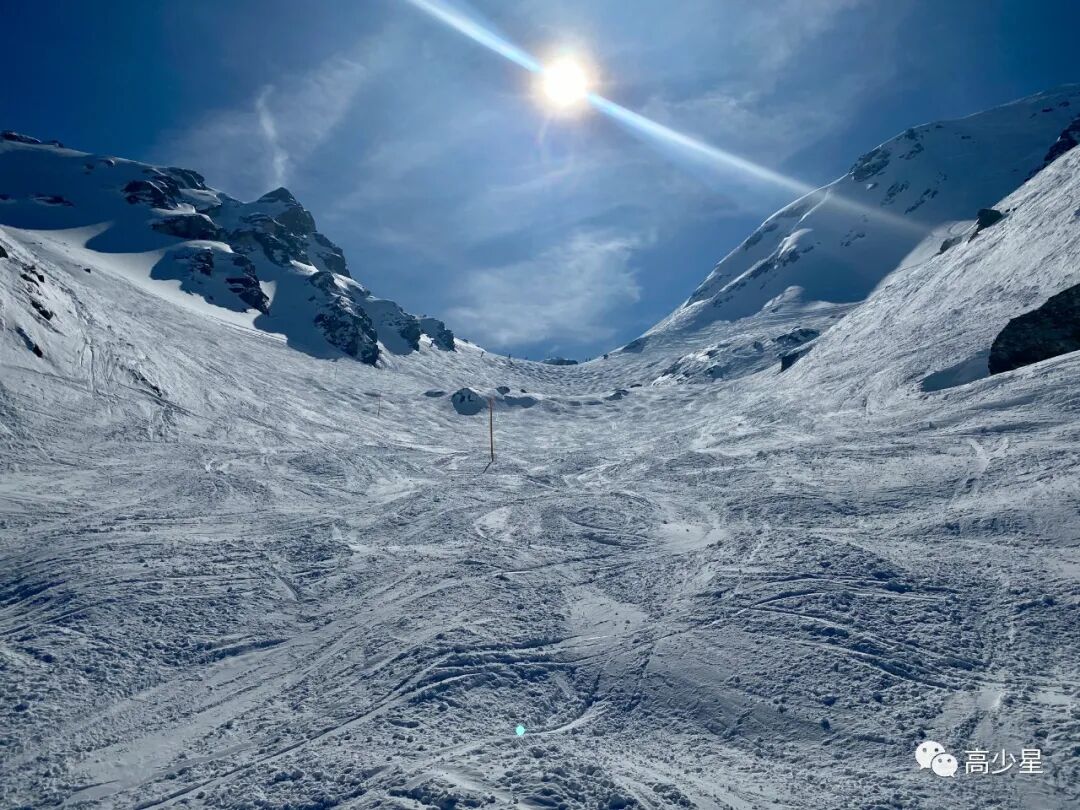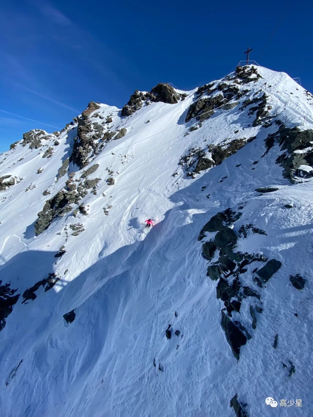 From the scale of the photo, you can clearly see that it’s longer and wider than expected—mainly because there was no machine grooming; it had just started snowing lightly, and with quite a few skiers already out on the slopes, the surface was mostly covered with a mix of small to medium-sized mushrooms of fresh powder. Having spent the day skiing on icy terrain in Zermatt earlier, this run felt absolutely exhilarating—I hadn’t engaged in such intense physical activity for ages. As a result, I ended up stopping eight times along the way just to catch my breath and regain my energy!