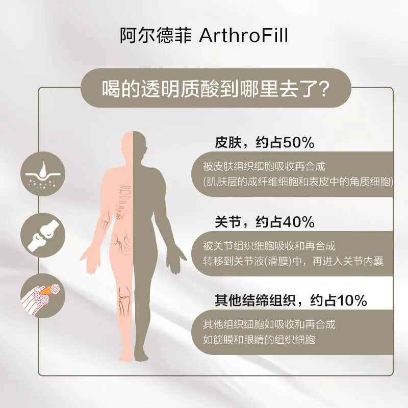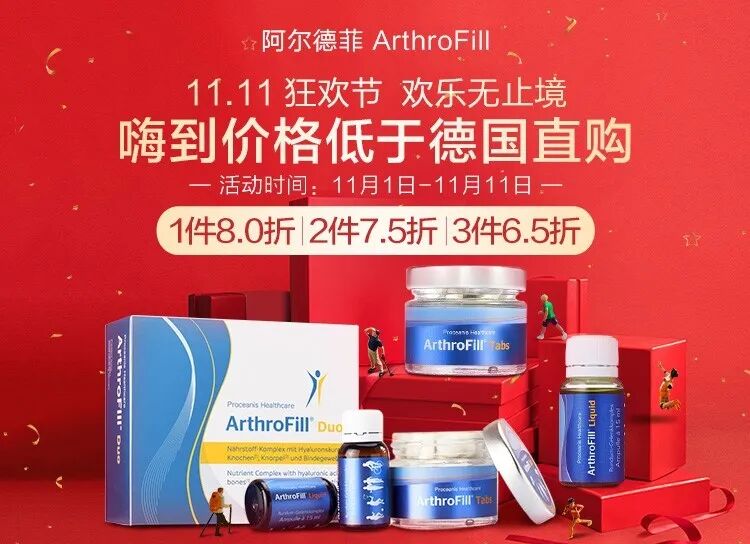 ArthroFill, the official flagship store of JD International, kicks off its Double 11 shopping festival with deals so amazing, they’re even cheaper than direct purchases from Germany!Replenish hyaluronic acid to protect your joints and minimize damage!▲ Long press to enter directlyJD International ArthroFill Official Brand Flagship Store Where has the hyaluronic acid I took gone?Half of it goes to the skin's connective tissue, while the other half—mostly—is directed toward the joints. A smaller portion is allocated to the eyes, bones, and the connective tissues of the fascia. That’s why taking Alderfer’s hyaluronic acid products not only helps maintain joint health but also simultaneously nourishes and hydrates the skin, while alleviating dryness issues in the eyes.