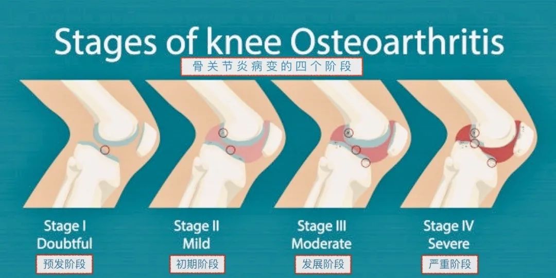 Like all conditions, osteoarthritis progresses through four distinct stages—so if you can identify it early,Pre-launch phaseAndInitial stageReceiving timely attention and treatment significantly increases the chances of recovery while keeping costs low and risks minimal. However, by the time the condition progresses to a more advanced stage, cartilage damage has already become severe, and accompanying inflammation further complicates treatment. In these advanced stages, surgery often becomes the only viable option for effective intervention. ▲ The Four Stages of Osteoarthritis LesionsIn the pre-release and early stages, we might only occasionally experience joint discomfort, such as: "Joints feel slightly stiff after prolonged sitting or when getting up in the morning, and you may occasionally experience pain while going up or down stairs. You might also notice some soreness and tenderness after walking longer distances or exercising." These symptoms are actually telling us that "there’s a problem with the cartilage."But because the pain isn’t severe enough or frequent enough, it’s often overlooked—missing the golden opportunity for timely treatment! Severe osteoarthritis, which develops later on, often progresses from earlier "cartilage damage," eventually leading to bone deformities and advancing into the advanced stages of osteoarthritis. This process can unfold rapidly—within just a few months—or may take several years. The following explanation of the condition, provided by the "German Joint Inflammation Rehabilitation Center," clearly underscores the critical importance of early treatment: "In the early stages, cartilage damage is limited to a very small area and occurs only on the surface—often going unnoticed. However, even from the outset, this minor injury can trigger significant changes. The damaged cartilage area loses its ability to bear weight, reducing the joint’s overall load-bearing capacity. As a result, the remaining healthy cartilage must absorb the full load, leading not only to excessive stress but also disrupting the even distribution of pressure across the joint. Over time, this imbalance accelerates further damage, affecting an increasingly larger portion of the cartilage."▲Changes in cartilage loading have exacerbated the area of cartilage damage.As this process continues, the area of cartilage capable of bearing the load gradually decreases—until large sections of cartilage are worn away, causing the original "joint cushioning space" to disappear. Without cartilage to protect the joint, the bones become fully exposed, leading to direct friction and contact with each other.▲ Comparison of mild initial injury to cartilage versus severe wear-and-tear in later stagesAs osteoarthritis progresses to its advanced stage, the bones undergo noticeable changes—on X-ray images, the bones clearly appear much broader, and large bone spurs have developed along the edges of the joints. These bone spurs (osteophytes) not only widen the joint space but also cause swelling and intensify inflammation. Moreover, as you move, these spurs can rub against each other, leading to even more pain.Advances in modern medicine have opened up more treatment options for osteoarthritis, such as direct hyaluronic acid injections into the knee joint, as well as surgical interventions—even joint replacement.However, the best approach to joint care is preventing injuries and slowing down degeneration—second only to promptly addressing issues when they arise. By the time a "death sentence" is effectively handed to the knee joint, the only remaining option is risky, high-cost surgical intervention.