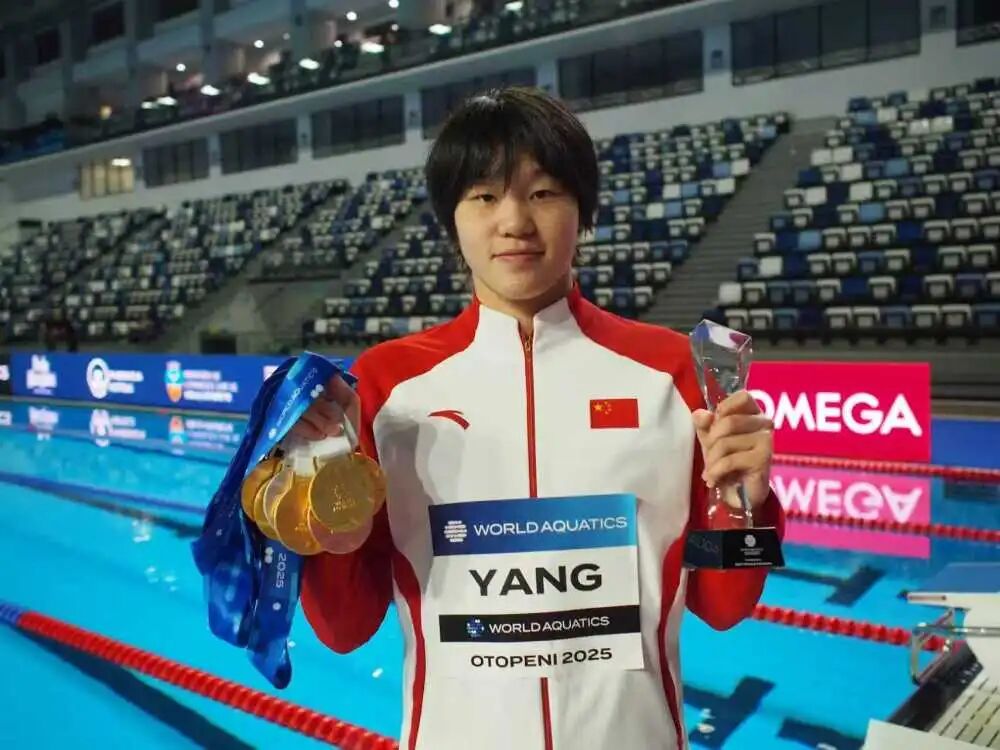 BUCHAREST, Aug. 25 (Xinhua) — Reporting from Otopeni, Romania, by journalists Zhou Xin and Zhang Gaiping — The World Junior Swimming Championships concluded on the evening of August 24 in Otopeni, Romania, marking a historic milestone for China's swimming team, which clinched both the most gold medals and the highest total medal count in the history of the event. Among them, 18-year-old Yang Peiqi emerged as the standout performer, claiming an impressive five golds, one silver, and one bronze. She also set two new meet records individually and was crowned the tournament's Most Valuable Player (MVP), earning widespread acclaim as the "star of the games."