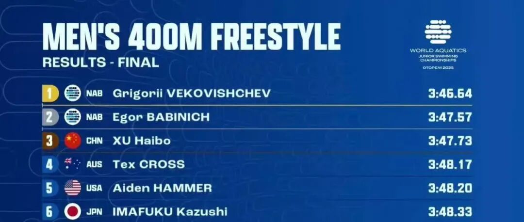 Swimming World Junior Championships Recap: On the first day, China defeated the U.S. team to claim their first-ever relay gold medal, while Xu Haibo secured a bronze in the men’s 400m freestyle.