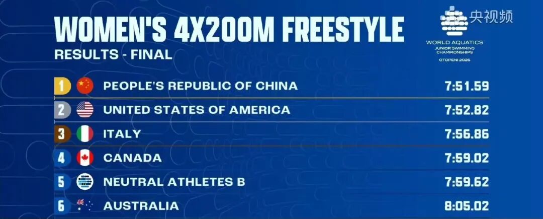 In the early hours of August 20, Beijing time, the Chinese team—composed of Yan Liao-shan, Gong Zhen-qi, Luo Ming-yu, and Yang Pei-qi—powered past the U.S. squad to claim gold in the women’s 4x200m freestyle relay final, clocking a remarkable time of 7:51.59.Securing the first gold medal of this year's World Junior Championships also marked China's swimming team's historic breakthrough, clinching their very first relay gold at the event. This achievement comes as a significant milestone, bringing them one step closer to their long-standing goal.World Youth Championship RecordJust 0.12 seconds separated the competitors. Notably, Yang Peiqi delivered a stunning comeback in the final 100 meters of the last leg, clinching the victory decisively.
