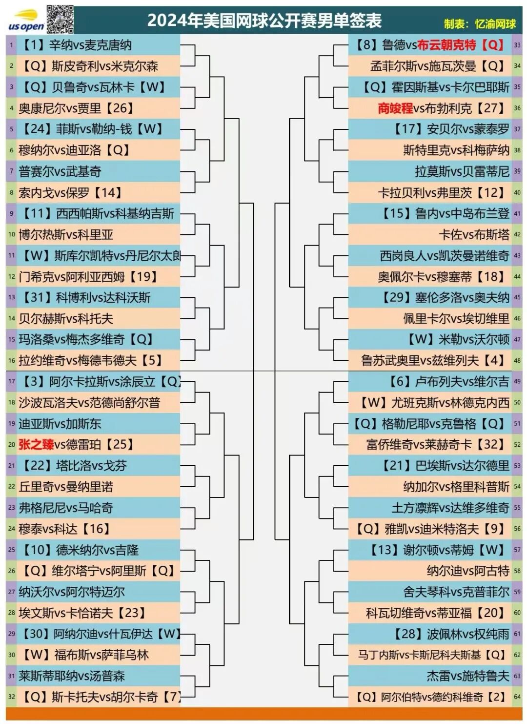 Here's the translation: --- The situation for Chinese players: Zhang Zhizhen, China's top-ranked men's tennis player, will face Britain's No. 25 seed Draper in the first round. This could easily turn into a five-set battle, with both players having a real chance to advance. Meanwhile, young talent Shang Juncheng will take on No. 27 seed Bublik in his opening match. Known for his unpredictable style of play, Bublik will undoubtedly pose a huge challenge for Shang. On the other hand, Bu Yunchaokete is making his Grand Slam main-draw debut, and stepping onto such a big stage right away means he’ll immediately face a highly seeded opponent—Norway’s Ruud. Tough luck, but it’s definitely a learning opportunity for this promising young player.