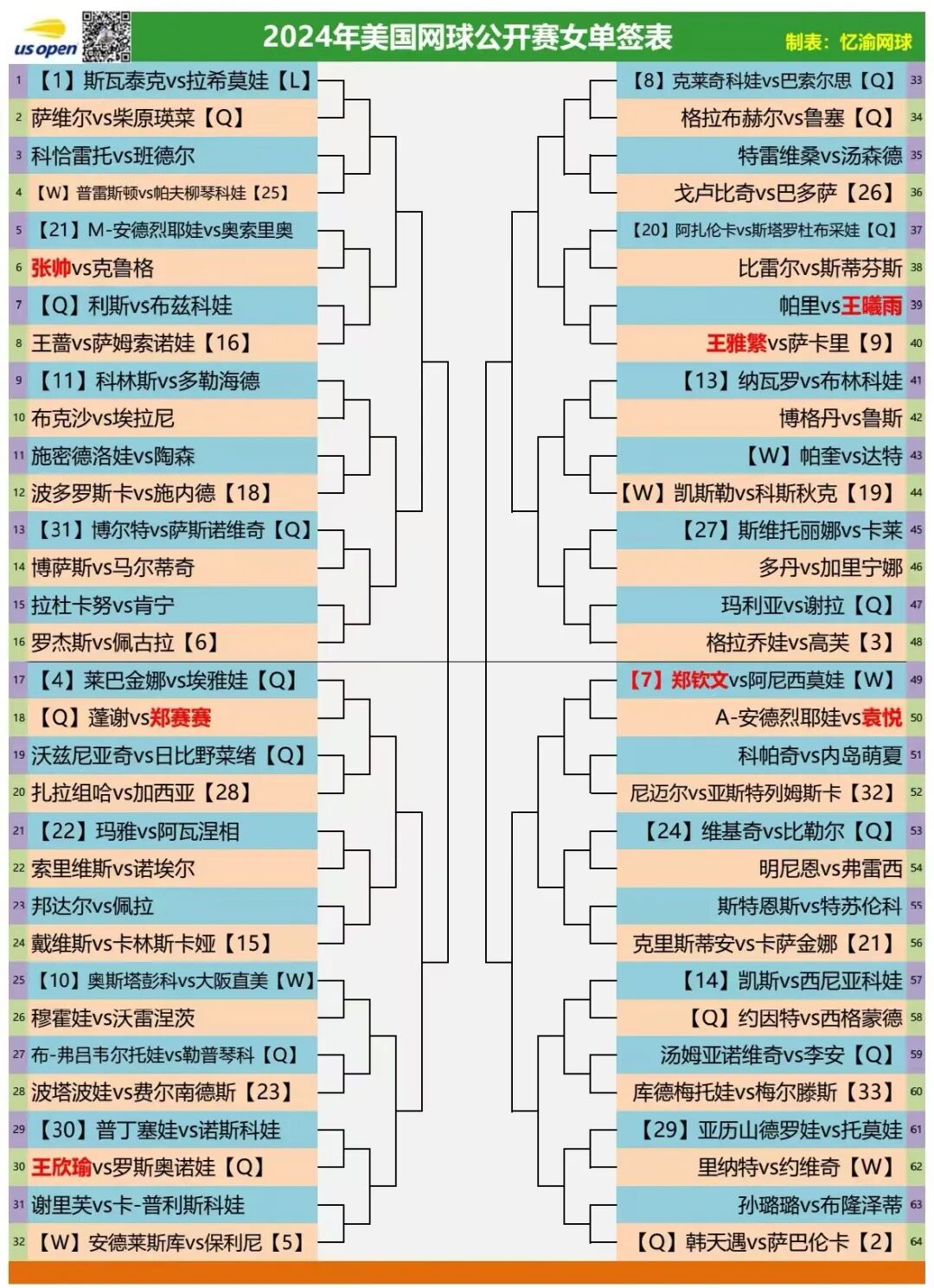 Here's the situation for Chinese players: In this year's US Open women's singles tournament, the Chinese contingent features a total of eight players—Zheng Qinwen, Wang Xinyu, Yuan Yue, Wang Yafan, Wang Xiyu, Zhang Shuai, Wang Qiang, and Zheng Saisai. While these players are placed in various spots on the draw, each faces challenges of varying degrees.