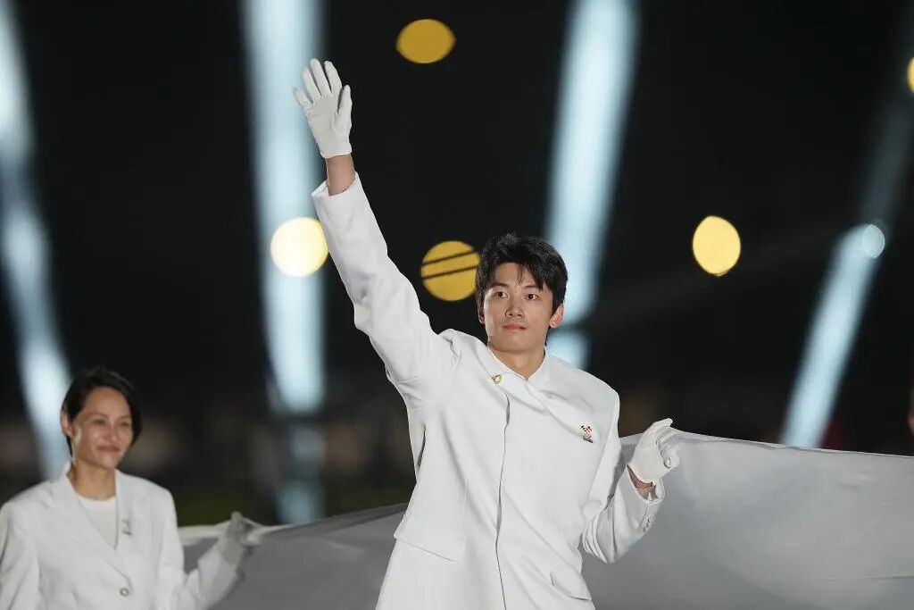 On August 7, Wang Shun (right), the flag bearer for the International Olympic Committee's flag, at the opening ceremony of the 12th World Games. Photo by Xinhua News Agency reporter Liu Kun.