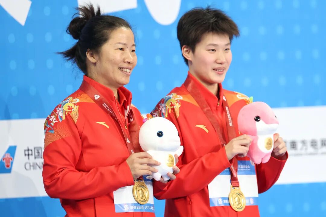 In the women’s 200-meter breaststroke final, Lu Qinyao from the Jiangsu team won the gold medal. The photo shows Lu Qinyao (right) at the award ceremony.