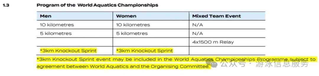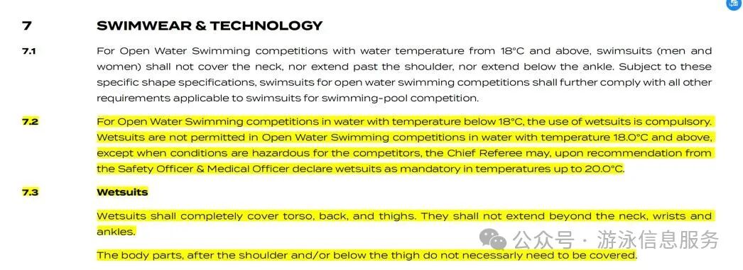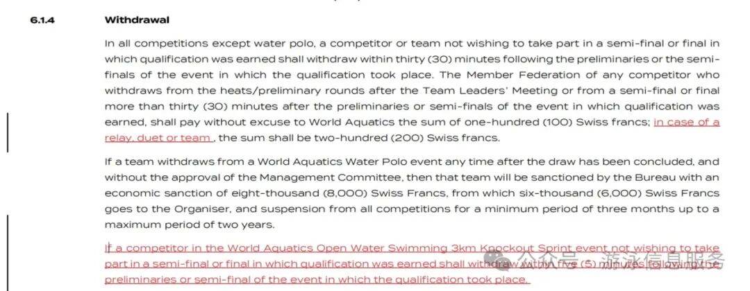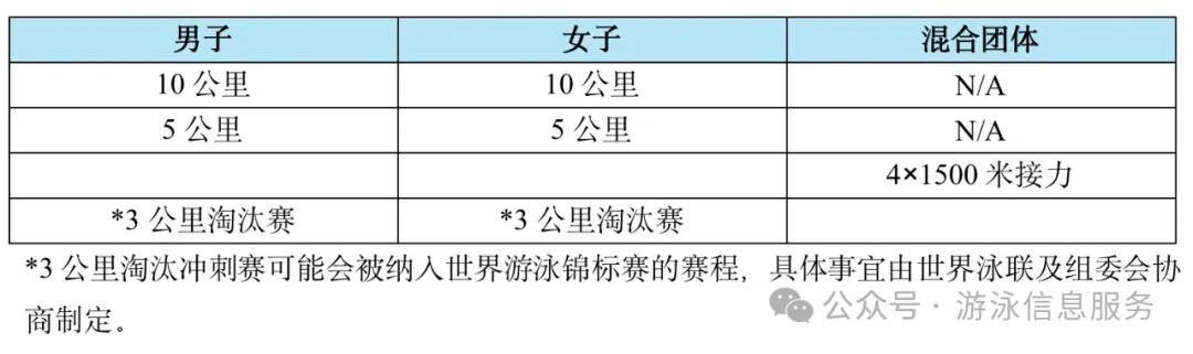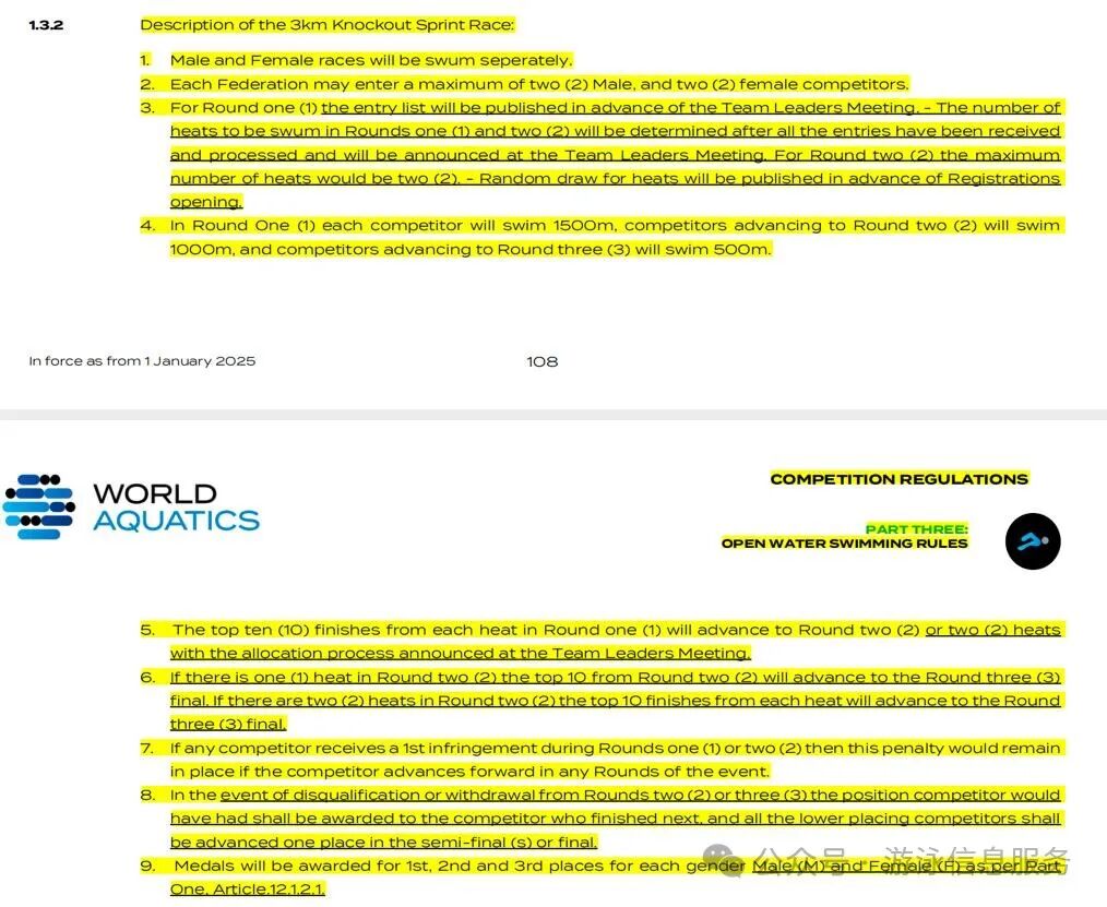 The 2025 World Swimming Series will implement the newly revised competition rules. Notably, the rules for open-water swimming have undergone several significant changes, including the introduction of a new 3-kilometer elimination race format. Below is a summary of the revisions relevant to open-water swimming competitions:I. New 3-Kilometer Elimination Race1. Rule 1.3 – World Aquatics Championships Open Water Swimming Events2. Rule 1.3.2 – Description of the 3km Elimination Race Rules(1) The men's and women's 3-kilometer elimination races will be held separately;(2) Each team may send up to 2 male athletes and 2 female athletes to compete;(3) The list of participants for the first round will be announced before the team leaders' meeting. The preliminary matches for both the first and second rounds will be finalized after all registration information has been processed and will be revealed at the team leaders' meeting. A maximum of 2 groups is allowed for the preliminary rounds of the second stage. The random draw results determining the preliminary group assignments will be published prior to the start of athlete registration.(4) Each athlete competes in a 1500-meter race during the first round, advances to a 1000-meter race in the second round, and then moves on to a 500-meter race in the third round.(5) Round 2: The top 10 athletes from each preliminary round group will advance to Round 2. If Round 2 is divided into 2 groups, the grouping plan will be announced at the team leaders' meeting. The specific group assignments will be determined based on each athlete’s ranking within their respective preliminary round group, and the advancement process will be officially announced at the team leaders’ meeting.(6) Round 3: If the second-round competition is in Group 1, the top 10 athletes advance to the third-round final; if the second-round competition is in Group 2, the top 10 athletes from each group advance to the third-round final.(7) Any athlete who receives their first foul penalty in the first or second round will have that penalty carried over and remain in effect for subsequent rounds of competition.(8) If an athlete is disqualified or withdraws during the second or third round of competition, their position will be filled by the next athlete in line, and all subsequent athletes’ rankings will move up accordingly.(9) According to Section 12.1.2.1 of Part One, the top three athletes in the Men's (M) and Women's (F) categories will receive medals.In the World Aquatics 3-kilometer open-water swimming elimination race, if an athlete chooses not to compete in the next round—having already advanced from either the preliminary or semifinal stages—they must withdraw within five minutes after the conclusion of the preliminary or semifinal event.II. Details of Relevant Rule Changes5.13.5 In FINA competitions, only FINA-approved biodegradable bottles may be used. Each athlete will receive 6 bottles (distributed by their respective national teams). Refueling officials are responsible for ensuring that all support personnel comply with this regulation.2. Rule 7: Swimwear and Technology(1) Rule 7.2: In open-water swimming competitions, thermal suits must be worn when water temperatures fall below 18°C. Diving suits are prohibited when water temperatures are at or above 18.0°C. However, unless competition conditions pose a risk to athletes, the Chief Judge may, upon recommendation from the Safety Officer and Medical Officer, declare that thermal suits are mandatory even in temperatures not exceeding 20.0°C.(2) Rule 7.3: Winter Clothing