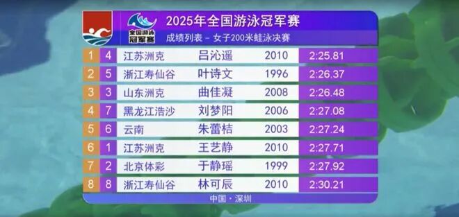 In the women's 200m breaststroke final, 15-year-old Lü Qinyao from Jiangsu stunned everyone with a remarkable finish in the last 50 meters, overtaking veteran Ye Shiwen to claim her first national championship title in 2:25.81—just ahead of the World Championships A-standard time (2:25.91). Ye Shiwen finished second with a time of 2:26.37, while Shandong’s Qu Jianing secured third place at 2:26.48.