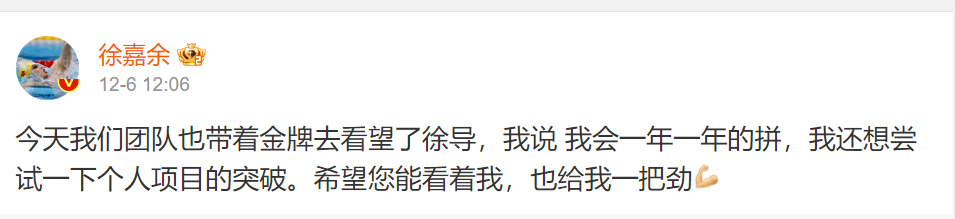 On December 6, national swim team member Xu JiaYu updated his Weibo: "Today, our whole team brought the gold medal to visit Coach Xu. I told him I’ll keep pushing myself year after year—and I’m also eager to make a breakthrough in individual events. I hope you’ll keep an eye on me and give me that extra boost!"