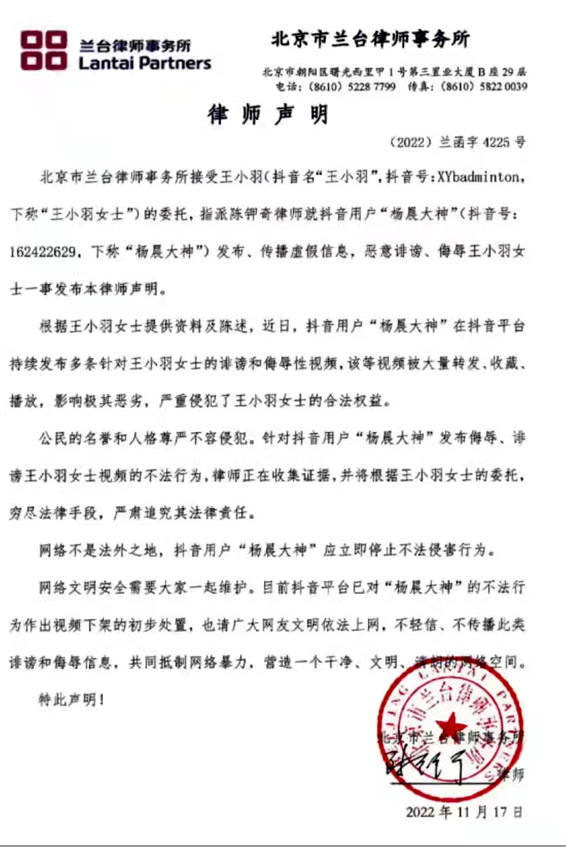 Recently, well-known badminton influencer Yang Chen—often referred to as "Yang Chen the Expert"—launched a public confrontation with fellow influencer Wang Xiaoyu. Yang first questioned the products endorsed by Wang, then escalated the conflict with a targeting Wang on multiple fronts. Meanwhile, Wang Xiaoyu has already entrusted Beijing Lantai Law Firm to gather evidence and prepare legal action against Yang Chen for allegedly engaging in malicious defamation and insulting Ms. Wang. What do you all think about this situation?