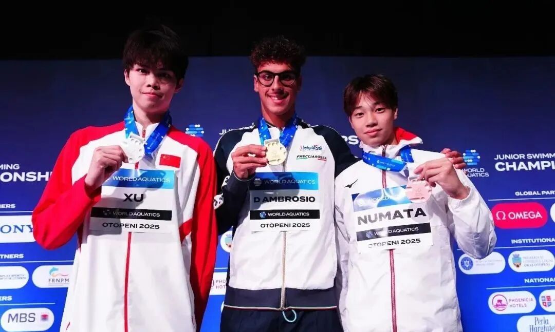 Men's 200m freestyle final,Xu Haibo set a new personal best, finishing second with a time of 1:46.67 and clinching his second medal of the Youth World Championships this year. Italian athlete Carlos D'Ambrosio) At 1:45.15, he shattered the meet record to claim victory, while Japanese athlete Numa Taiki finished third with a time of 1:46.70.