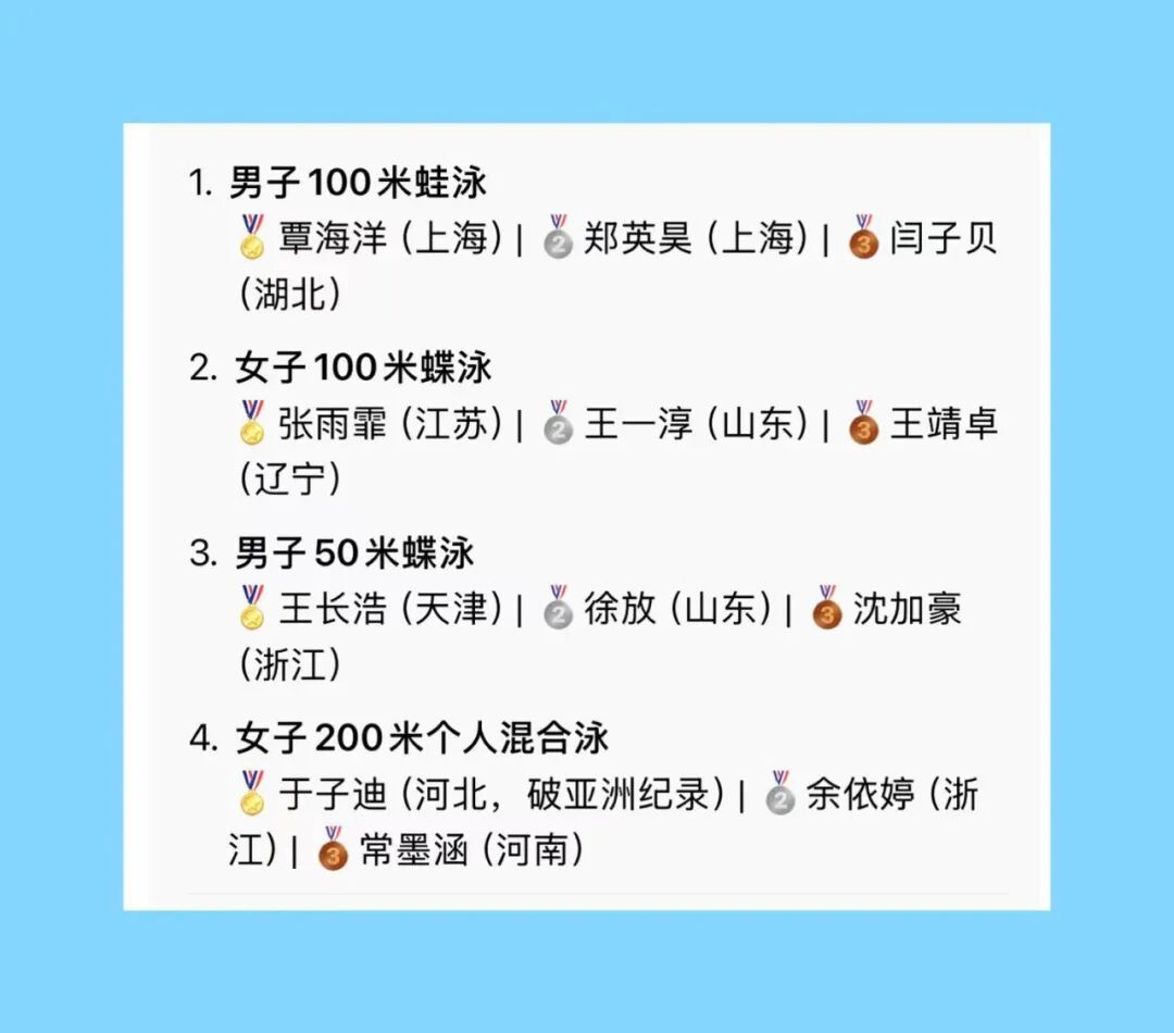 ✅ Women's 100m BreaststrokeTang Qianting topped the semifinal with a time of 1:06.31—a performance that would easily hold its own on the world stage!