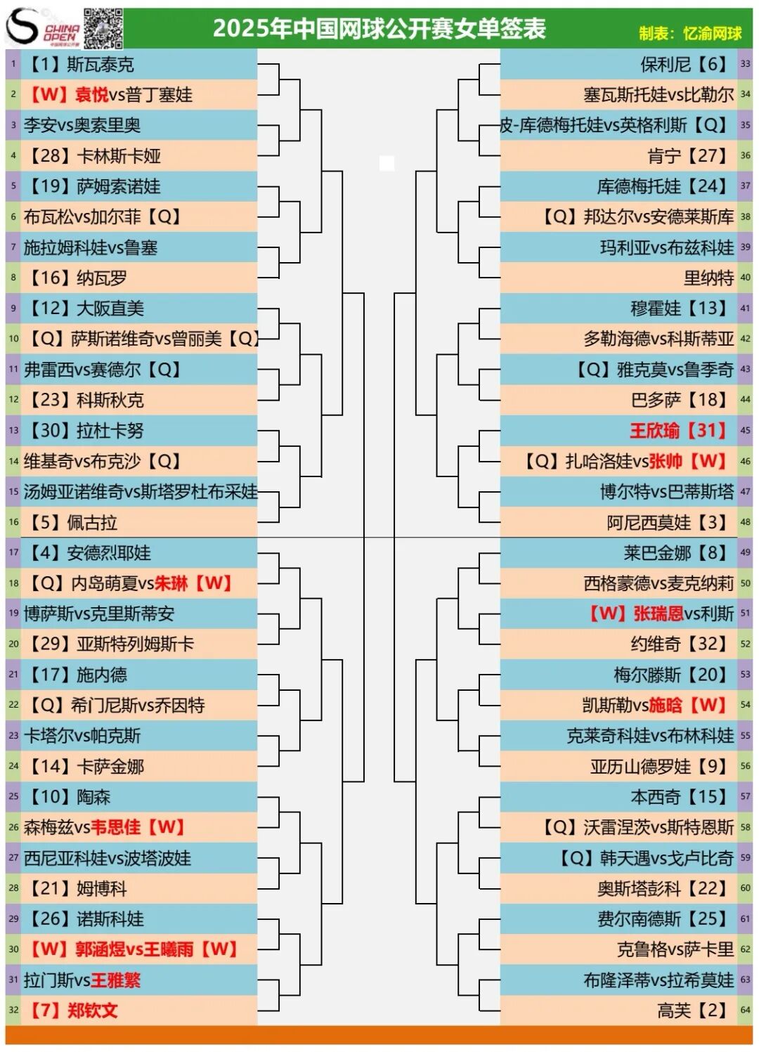 The main draw of this women's singles event11Among the Chinese players, Wang Xiyu and Guo Hanyu will face each other in the first round.“Chinese Derby”Directly securing one player's advancement to the second round. Yuan Yue will face Kazakhstan's Putintseva; the winner will then take on top-seeded Swiatek. Meanwhile, Zhu Lin will face a qualifier—if she emerges victorious, she’ll face Andreeva instead, making for a highly competitive matchup.“Pre-emptive move in the Golden Flower civil war”Veteran Zhang Shuai previously made a breakthrough last year.“Wildcard Miracle”Making it to the quarterfinals, she'll first face a qualifier this year—and if she advances, she’ll square off against Wang Xinyu in another all-Chinese showdown.