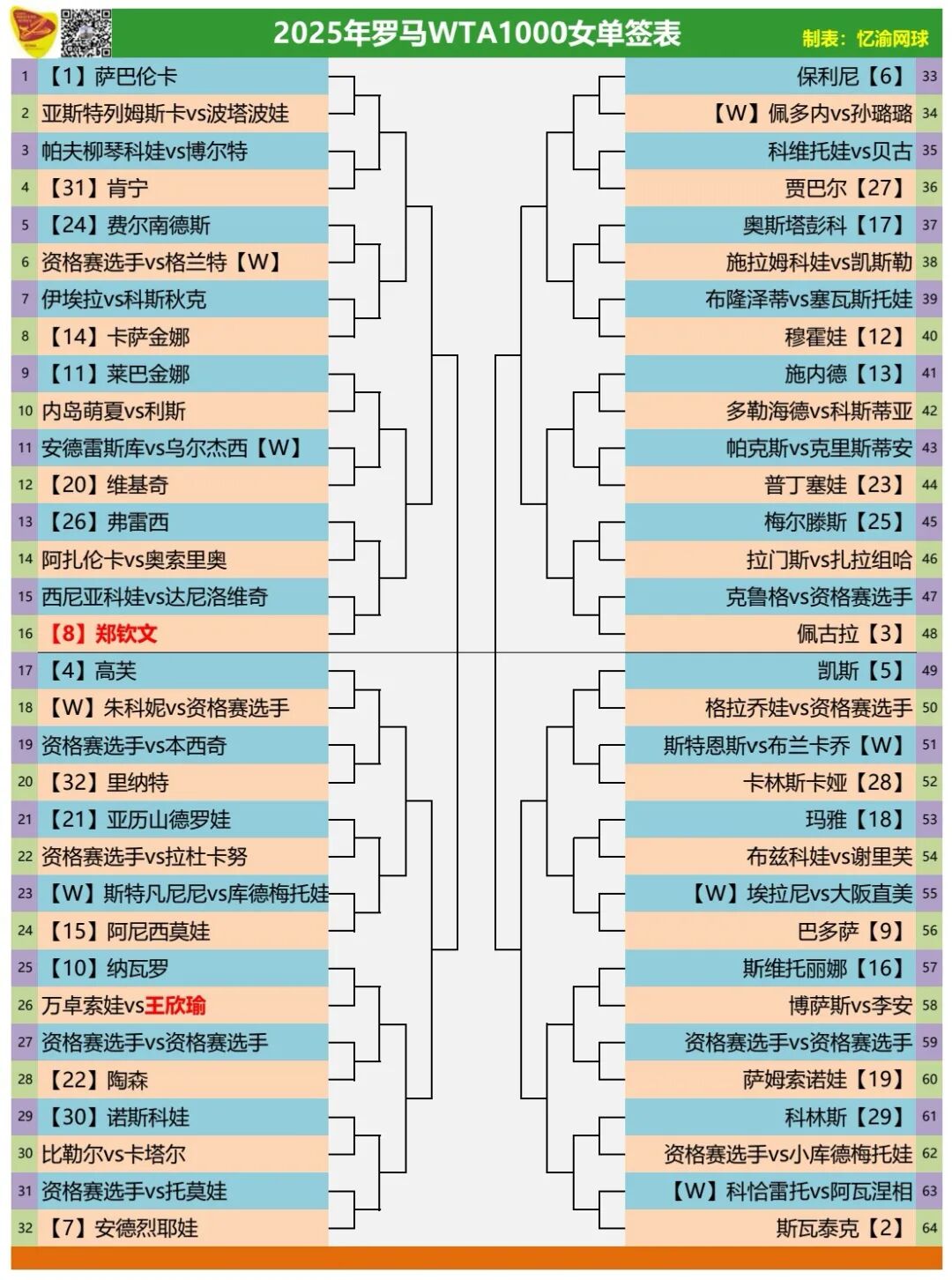 Zheng Qinwen to face Sabalenka again as Rome Open draw is announced.